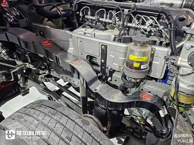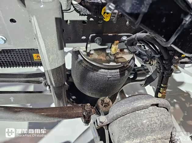 重汽的新底盘采用气囊桥的后桥推力杆就是X型,如果是钢板桥,就是V推。像X推与气囊悬挂搭配,可以更好的稳固底盘,防止车桥位移,对行车稳定性有明显提升。