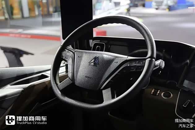 方向盘就是重汽现在家族化的一款四幅式调节的方向盘,汕德卡和黄河也在用,有定速巡航和多媒体控制功能。方向盘的调节角度比之前而言的话是做的更大了一些,采用的是气动锁止,能给驾驶员带来更为舒适的坐姿体验。