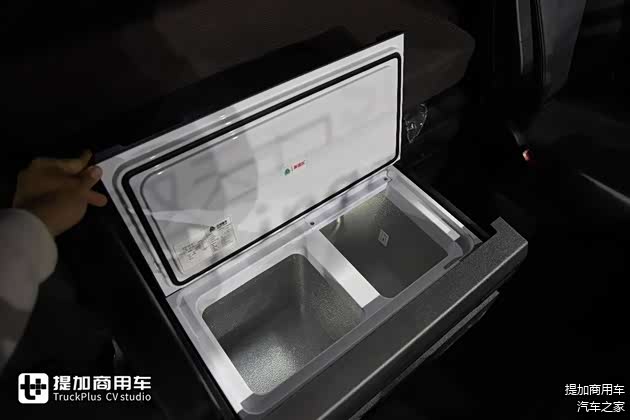 卧铺下方有车载冰箱和逆变器,车载冰箱为英德尔给重汽定制的,带分区,像日常的饭菜,或是饮品之类的都可以扔在冰箱的不同储存区域当中。