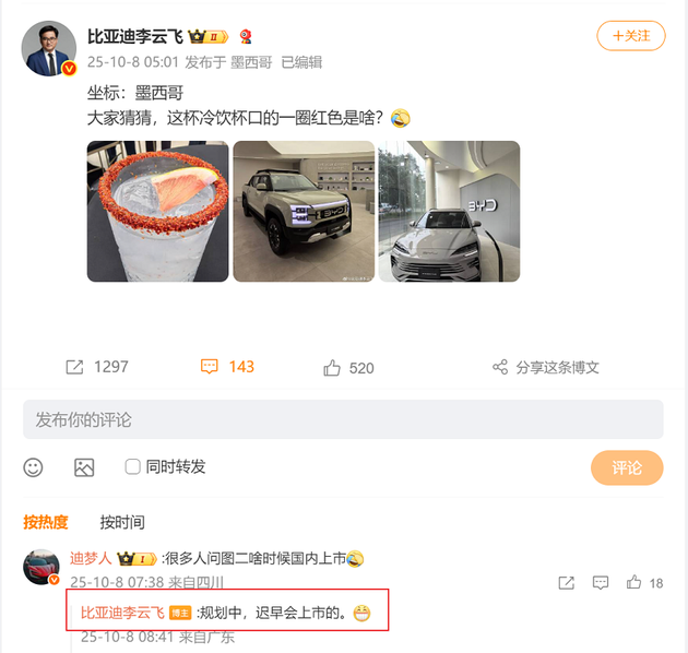 比亚迪皮卡SHARK 6已经在海外多国上市,而在去年10月份左右,比亚迪品牌及公关总经理李云飞回应网友提问其皮卡产品何时在国内推出时说道:规划中,迟早会上市的。再海外打拼多年的这款产品,今年也有可能在国内上市。