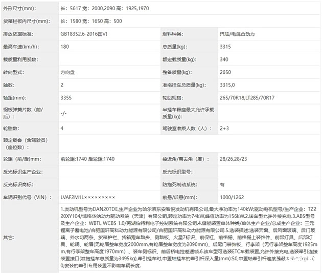 根据曝光申报图来看,新车外观与目前在售火星9 48V柴油轻混或火星9 汽油动力版本并没有显著差异。数据显示,新车搭载“2.0L汽油发动机+驱动电机”的插混系统,核心参数相较火星9传统轻混版实现全面跃升。发动机采用哈尔滨东安智悦发动机有限公司的DAN20TDE型号,排量1999ml,最大净功率140kW。驱动电机采用博格华纳品牌电机,型号为TZ220XY104,电机额定额定功率74kW,峰值功率为156kW。公示信息当中,油耗显示仅为1.4L/100km,对比火星9柴油轻混版6.8L/100km的综合油耗,插混动力对于降低油耗非常显著。