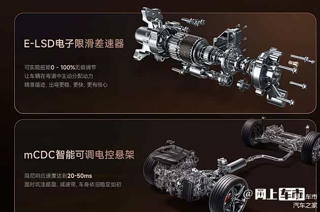 最后说操控,这也是MG7的宣传重点。底盘采用前麦弗逊+后多连杆独立悬架,顶配车型依旧搭载了mCDC智能可调悬架和E-LSD电子限滑差速器,这可是MG7操控的灵魂所在。要我说,追求运动操控的就得干高功率顶配版本,低功率买个“运动风味”车多没意思。