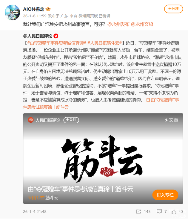 就在这份善意与理解持续温暖人心之际,广汽埃安高管通过个人微博主动发声:“就让我们广汽埃安把永州故事续写,可好?”简短的表达,迅速在社交平台引发广泛关注与讨论。