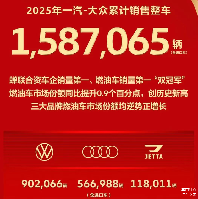 一汽-大众凭借全年1587065辆的销量(含进口车),再次将合资车企销量第一、燃油车销量第一的“双冠军”头衔收入囊中。其大众品牌交付902066辆,是国内最畅销的单一汽车品牌。