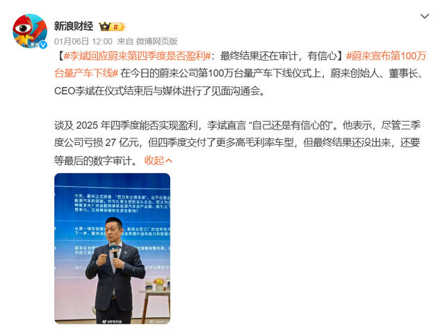 蔚来第100万台量产车在安徽合肥工厂下线,李斌在工厂庆祝活动上,对媒体提出的“四季度能否盈利” 作出回应:“最终结果还在审计,但我们有信心。”