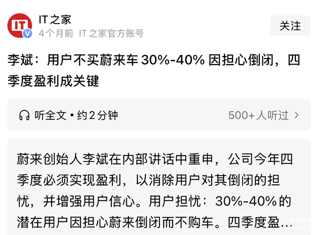 更为值得注意的是,对于蔚来而言,盈利或许已经是成为不得不做的事情。媒体消息显示,李斌在内部讲话中曾坦言,当前有30%-40%的潜在用户不购买蔚来汽车,是因为担心公司可能会倒闭。