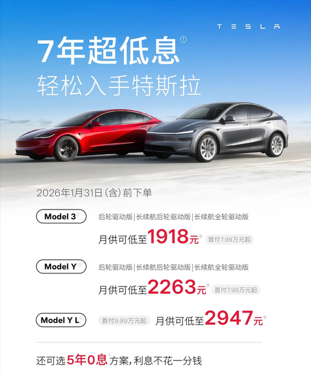 2026年1月6日,特斯拉中国正式推出限时超长期购车方案“特悠享”,首次在中国市场提供长达7年的超低息贷款服务。同时, Model Y L首次推出5年0息方案,Model 3/Y也可在1月31日前选择5年0息优惠。