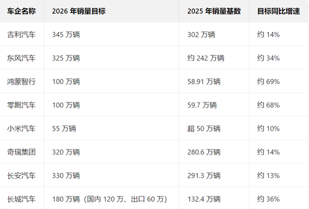 以吉利、奇瑞、长安为代表的头部传统车企,目标增速均锁定在 13%-14% 区间,与行业普遍预期的市场增速基本匹配。