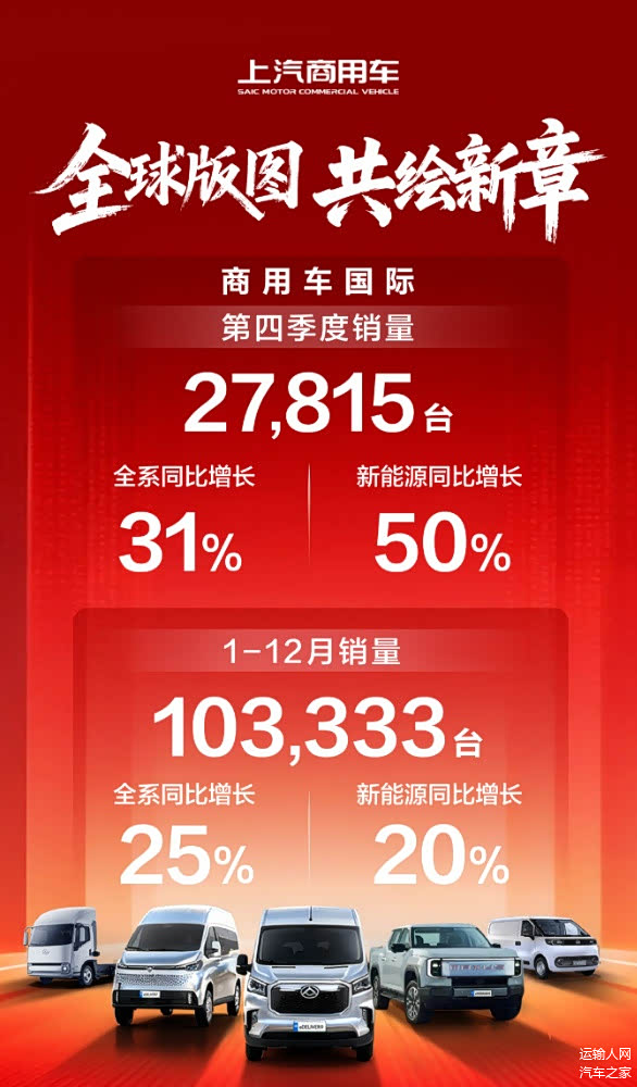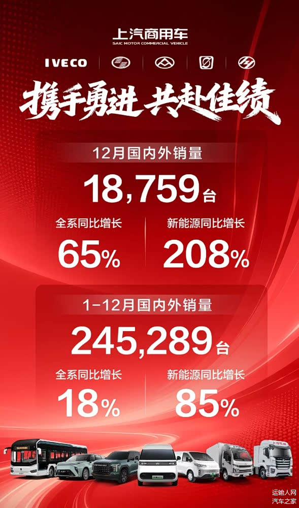 最新数据显示,2025年,上汽商用车全年销售24.5万辆,同比增长超18%;零售突破25万辆,实现月销同比“八连增”。新能源销量同比增长85%,国内热销超5.8万辆,单月渗透率突破50%。海外出口达10.3万辆,同比增长超25%,市场覆盖全球超100个国家和地区。多业务线齐发力,轻商出口量位列中国车企第二;轻客国内市占率与出口量双第一;皮卡出口居中国品牌第二;跃进轻卡销售超4万辆,同比激增近128%。