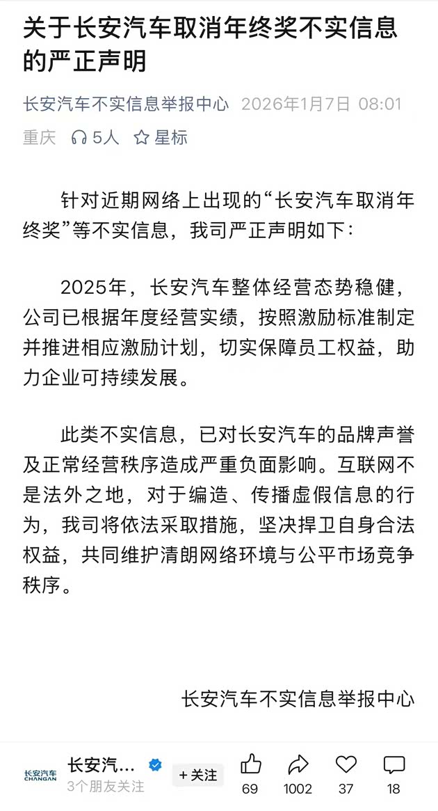 1月7日,长安汽车不实信息举报中心发文回应了网上关于长安汽车取消年终奖的信息。长安汽车不实信息举报中心表示,“2025年,长安汽车整体经营态势稳健,公司已根据年度经营实绩,按照激励标准制定并推进相应激励计划,切实保障员工权益,助力企业可持续发展。此类不实信息,已对长安汽车的品牌声誉及正常经营秩序造成严重负面影响。互联网不是法外之地,对于编造、传播虚假信息的行为,我司将依法采取措施,坚决捍卫自身合法权益,共同维护清朗网络环境与公平市场竞争秩序。”