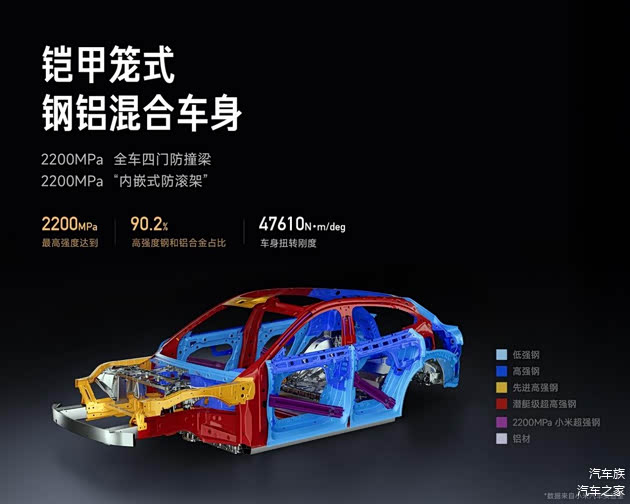 安全设计方面,YU7的A、B柱内部以及四门防撞梁均采用了与王国栋院士团队、育材堂联合研发的2200MPa超强钢,笼式车身的高强度钢和铝合金占比高达90.2%。车头部分的7系铝合金防撞梁覆盖率高达74.4%,可溃缩吸能区长度接近280mm,远超同级车型。
