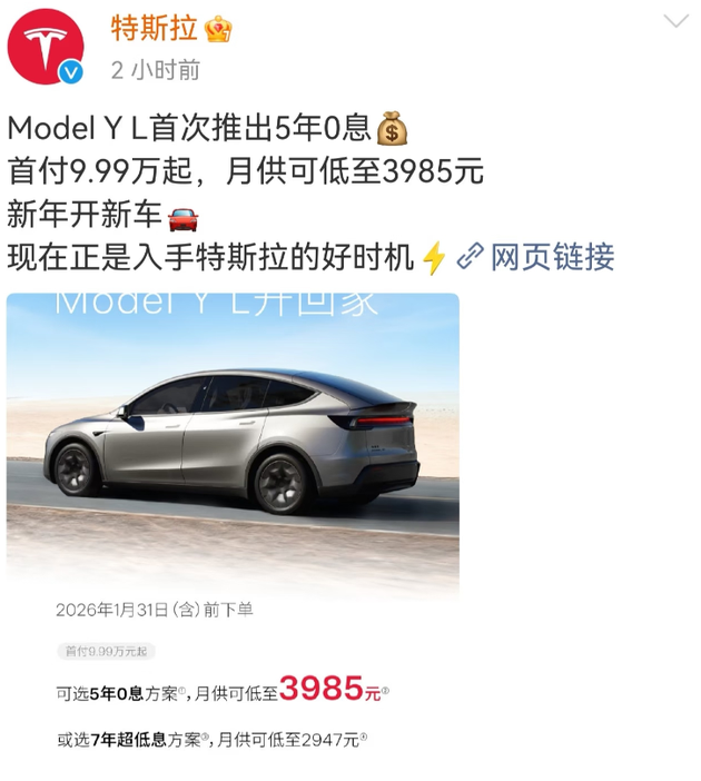 “合资车刚降完,特斯拉又来补刀了!”开年车圈的价格战还没降温,特斯拉突然甩出的“王炸”又把网友炸懵了—— Model Y L首次推出5年0息政策,首付9.99万起,月供低至3985元,相当于“每月花一部手机的钱就能开特斯拉”。这波操作,直接把原本就白热化的车市竞争推向了高潮,网友的讨论已经从“买合资还是国产”,变成了“特斯拉这波是真福利,还是逼死同行的节奏?”