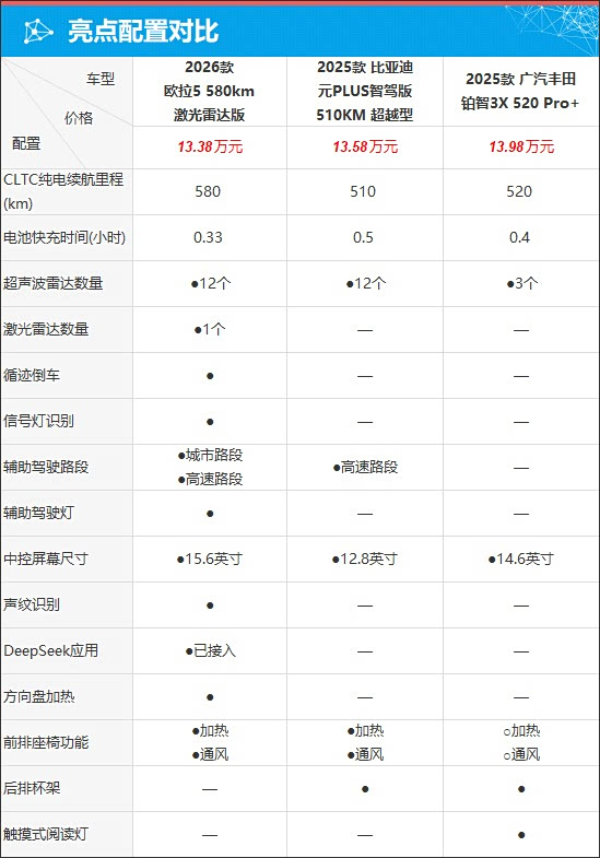 具体到车辆配置层面,我们挑选了售价尽可能相近的车型。通过表格对比来看,欧拉5的CLTC纯电续航里程达到580km,是3款车型中最长的,并且电池快充时间也最短,仅为0.33小时。此外,欧拉5独占1个激光雷达,使其拥有城市/高速路段的辅助驾驶能力,并且还配备了辅助驾驶灯,这在同级中较为少见。舒适性配置欧拉5也占有一定的优势,不仅配备前排座椅加热/通风功能,还独占方向盘加热,拥有更好的用车体验。