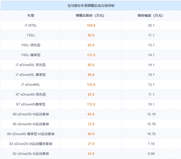 此次根据车型、配置不同降幅最低为900元,最高达到30.1万元,其中降幅最高的i7 M70L从189.9万元的官方指导价调至159.8万元,降幅高达30.1万元,诸如X6/ 7系/X7等豪车普遍都有超10万以上的降幅。