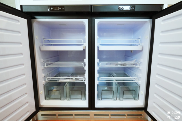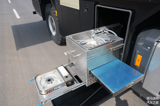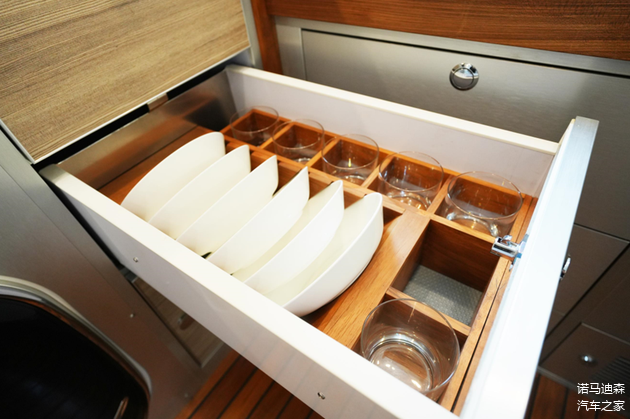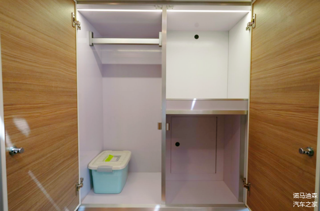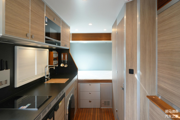 进入中部,首先看到的是储物柜,它就像一个宝藏收纳库,不论是旅行衣物、户外装备还是日常用品,都能在这里找到安身之所,让车内保持整洁有序。对面便是标准厨房,虽空间紧凑,但功能齐全。德国品牌的 2100KW 单眼电磁炉,火力强劲,满足简单烹饪需求。嵌入式蒸、烤一体箱,能为你烤制出美味的点心与佳肴。152L 分体嵌入式冰箱,可储存新鲜食材,让你随时享受美食。