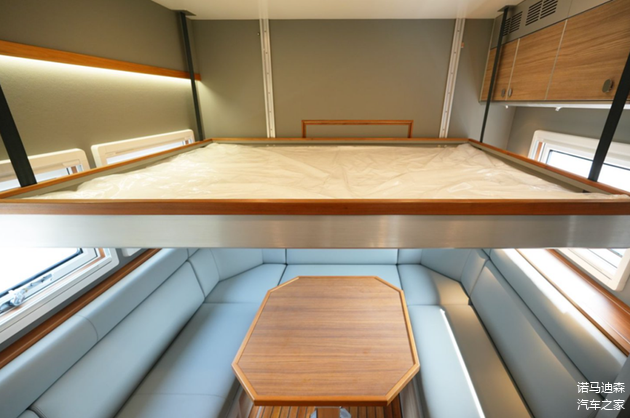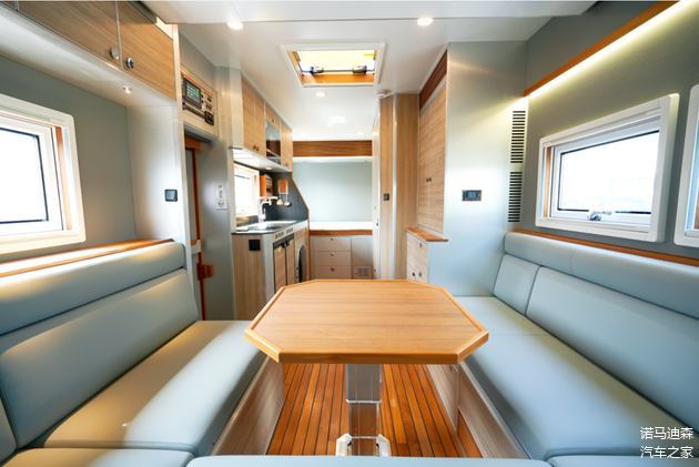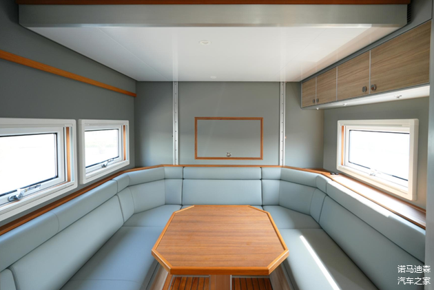 整车采用船用柚木地板,植物油抛光,无化工油漆,赤脚走在上面,感受自然木材的温润质感。窗户和天窗都是诺马迪森专有的窗户,搭配英国游艇级遮阳帘和防蚊网。客厅顶部荷兰品牌游艇级天窗,可内外开启,同样配备英国品牌游艇级遮阳帘和防蚊网,保证车内采光与通风的同时,又能有效阻挡蚊虫与阳光直射。生活舱主门配备美国品牌电动门锁,支持密码开启、磁卡开启及室外钥匙开启,方便又安全。还有诺马迪森四级踏步铝合金自动楼梯,方便上下车,尽显贴心。车身右侧的电动遮阳棚以及户外厨房,把细致入微展现的尽显无遗,为户外露营提供舒适配套。