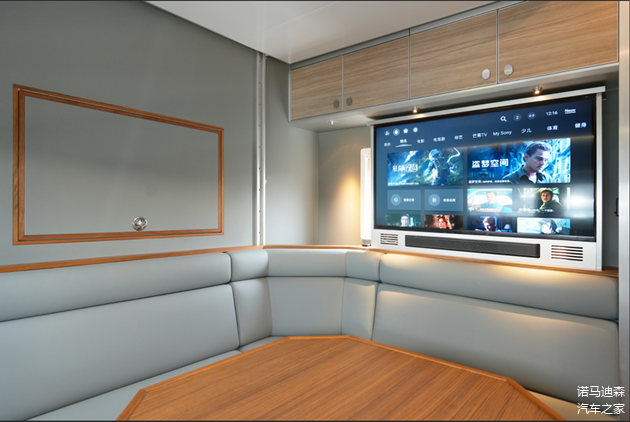 “穿越者B”(长轴)生活舱前部,是一个充满创意的环形沙发与电动升降桌组合的多功客厅区域。这不仅是日常休闲娱乐的欢聚地,还是巧思的睡眠空间变身点。当夜幕降临,降下电动升降桌,环形沙发瞬间变成一张宽敞的双人床,尺寸达到 1400mm×2000mm,柔软的乳胶沙发垫,给予你如同在家般的舒适睡眠体验。而上方1400mm×1970mm规格的电动升降床同样令人惊喜,为整个客厅增加了额外的居住空间,对于多成员出行的家庭或团队来说,这无疑是一大福音。旁边配备的升降电视,在休息时光为大家提供丰富的娱乐节目,让旅途不再单调。