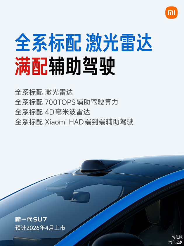 新款车型很重要配置变化是全系标配激光雷达,还配备Thor-U 芯片以及4D毫米波雷达,这也使得全系车型都可以使用小米端到端辅助驾驶功能,看齐同价位新势力水平。安全配置层面,车身结构采用2200MPa超强钢,全系标配9个安全气囊,新增2个后排侧气囊,电池组的防护也进一步强化,算是响应了群众呼声。