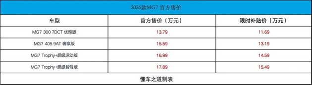 【懂车之道 产品】近日,懂车之道获悉,广州,2026款 MG7正式发布上市,官方售价区间为13.79-17.89万元,限时补贴价区间为11.69-15.49万元。据悉,新车将对智能化配置进行升级。下面,和大家一起来看看新车的产品力如何?