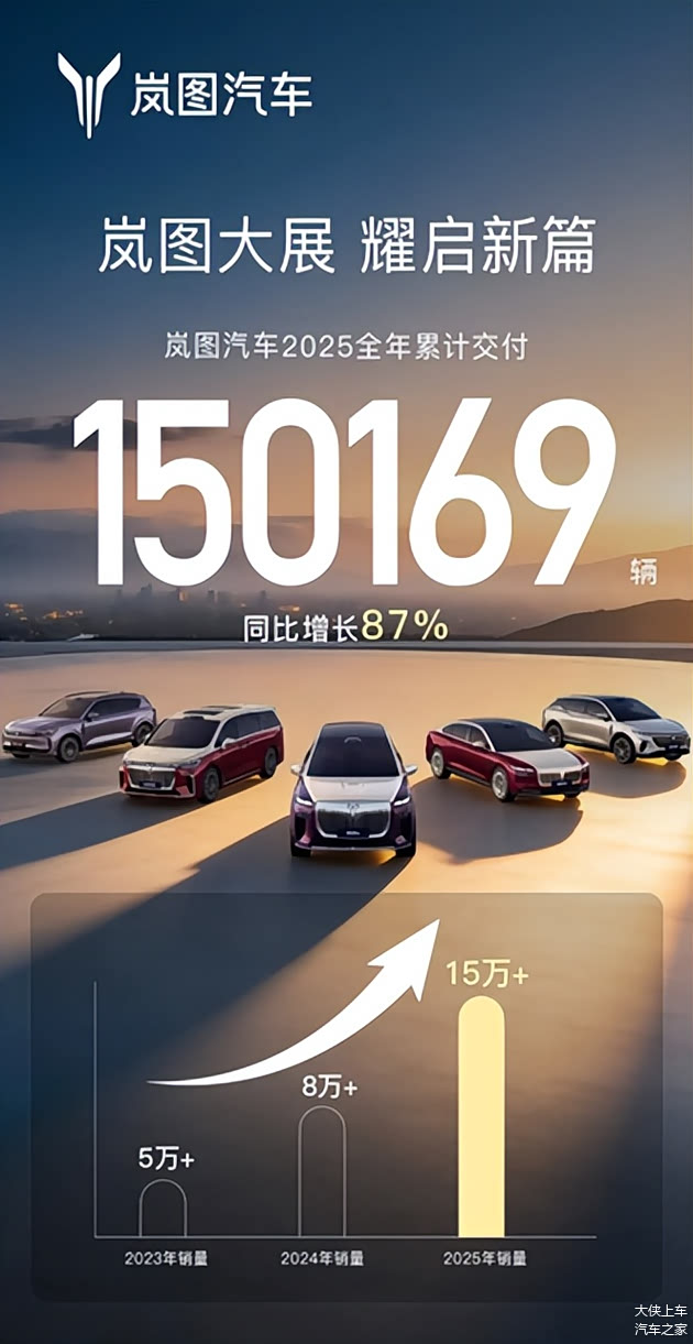 从2022年交付1.94万辆,到2023年的超5万辆、2024年的超8万辆,再到2025年迎来的超15万辆,连年攀升的岚图汽车,不仅以三年复合增长率超100%的稳健增速,彰显出国家队的沉稳,还凭借短短7个月就实现从20万辆到30万辆的跨越,成为首个达成30万辆下线的央国企高端新能源品牌,夯实自身作为“央国企高端新能源第一品牌”的领先地位!