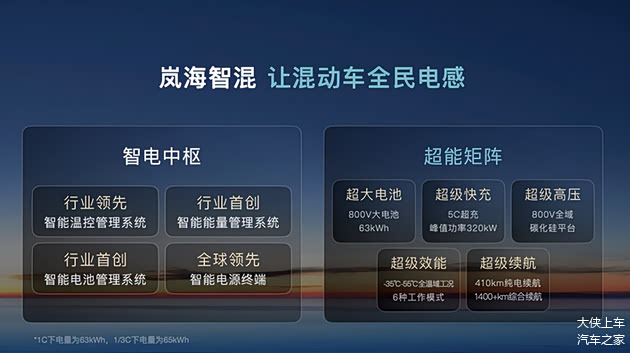 其中,“智电中枢”能通过行业领先的智能温控管理、行业首创的智能能量管理与电池管理系统,实现对整车能量流、热管理及安全状态的全局智慧调控,让补能效率更高、能耗表现更优;“超能矩阵”融合了超大容量电池、超级快充技术、全域800V高压平台与超长综合续航能力,这使用户在绝大部分用车场景下都能以纯电模式驱动,享受零油耗、低噪音的静谧平顺体验,还让整车充电效率与燃油车相当,长途出行时也无需为续航与充电焦虑。