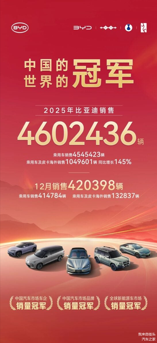 2025年已正式结束,也就到了各家车企结算2025年业绩表现的时候了,比亚迪连续第三年成为国内最畅销的车企,于2025年向全球市场共售出4,602,436辆新车(包括约5.7万辆的商用交通工具),对比2024年取得7.73%的稳定增长。