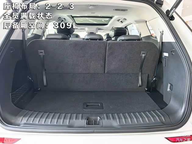不止坐得舒服后备箱空间同样惊喜,在三排座椅全部启用的情况下,仍有309L的容积,能轻松放下3个20寸登机箱和一些随身行李,全家出游也不用担心车内空间不足;如果放倒第三排座椅,容积瞬间拓展至969L,过年回家装下父母的爱心年货绰绰有余;要是需要装载大件物品,2-3-2座椅布局可以将二排和三排座椅全部放倒,能形成2876L的超大纯平空间,露营装备、婴儿车甚至小型家电都能轻松容纳,空间灵活性堪称“移动的家庭仓库”。