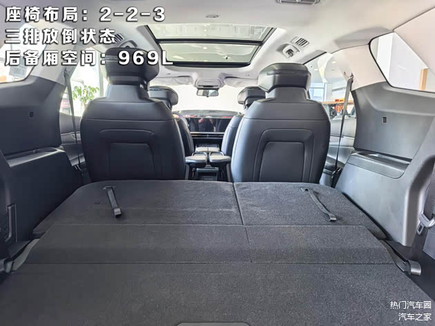 不止坐得舒服后备箱空间同样惊喜,在三排座椅全部启用的情况下,仍有309L的容积,能轻松放下3个20寸登机箱和一些随身行李,全家出游也不用担心车内空间不足;如果放倒第三排座椅,容积瞬间拓展至969L,过年回家装下父母的爱心年货绰绰有余;要是需要装载大件物品,2-3-2座椅布局可以将二排和三排座椅全部放倒,能形成2876L的超大纯平空间,露营装备、婴儿车甚至小型家电都能轻松容纳,空间灵活性堪称“移动的家庭仓库”。