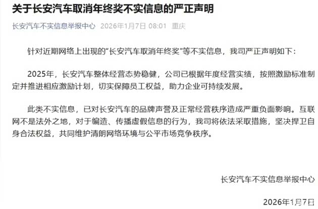 长安汽车1月7日对外发布声明,正式回应近期网络流传的“取消年终奖”传闻。声明指出,相关消息为不实信息,公司2025年整体经营态势稳健,已依据年度经营实绩与激励标准,制定并推进相应激励计划,以保障员工权益,支撑企业可持续发展。