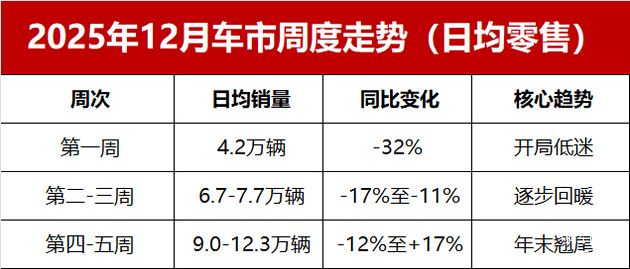12月车市的"前低后高"走势也很有看点。第一周日均零售才4.2万辆,同比暴跌32%;随着新能源车购置税免税窗口期临近,消费需求集中释放,第五周日均销量直接飙到12.3万辆,同比增长17%,年末翘尾效应显著。这种波动背后,政策调整是核心推手:去年12月以旧换新政策加码抬高基数,今年政策收紧让消费者年初观望,而年末免税政策到期又催生了集中购车潮。