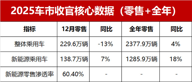 刚出炉的乘联会数据太关键了!2025年国内乘用车市场完美收官,全年零售2377.9万辆同比增长4%,12月零售229.6万辆环比涨3%,看似平稳的数字背后,其实藏着车市格局的大变化。2025车市收官揭秘:新能源渗透率破60%,销量增长4%藏着这些信号!
