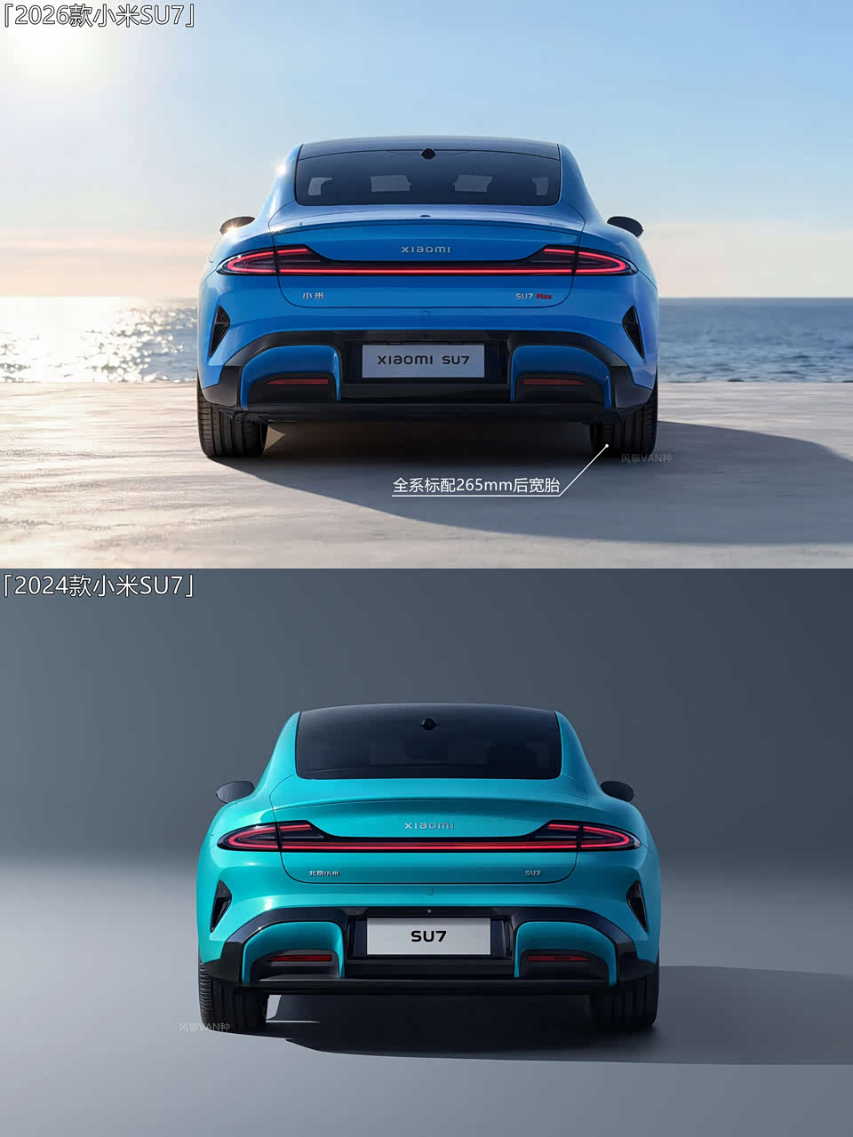 底盘部分,2026款小米SU7全系标配前四活塞固定卡钳及前245后265宽胎,PRO及MAX版标配闭式双腔空气悬架+CDC可变阻尼减振器。