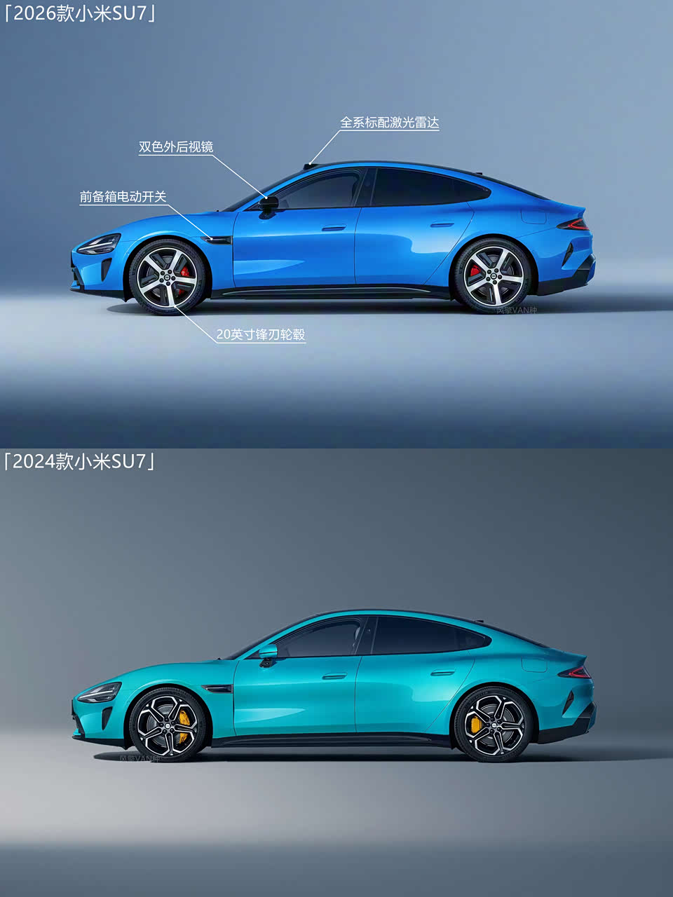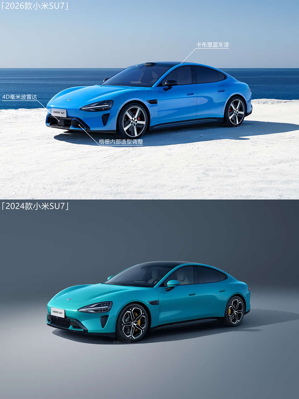 外观部分,2026款小米SU7外观造型整体延续了2024款车型的设计,外观部分比较明显的变化包括前格栅内部结构调整、牌照框下方新增4D毫米波雷达、黑色外后视镜、新款20英寸锋刃轮毂以及全新卡布里蓝车漆。
