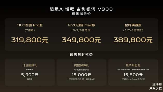 1月7日,吉利银河旗下V系列的首发之作,“AI全场景家庭旗舰MPV”——吉利银河V900正式开启预售,共计3个版本,预售指导价格区间为31.98万元~38.98万元。新车围绕中国大家庭出行的真实需求,以宽奢空间、豪华驾控、全维安全、AI智能几大全能满配实力,重新定义豪华旗舰MPV价值标准,树立AI全场景豪华出行新高度。