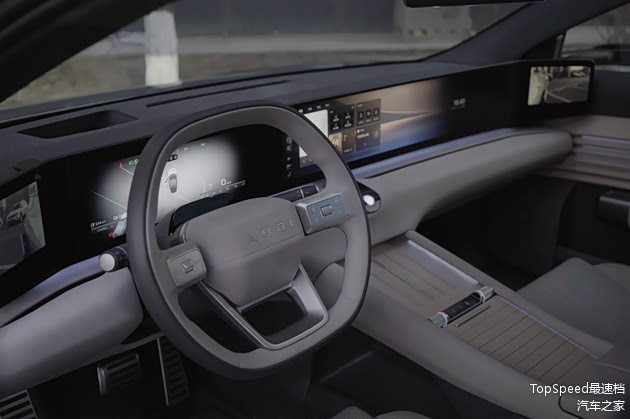 回归车内,与特斯拉Model 3的一“屏”如洗不同,它是用多种可视化的屏幕相互交互,用最大的视觉冲击力展示新能源时代的未来。巨大的59英寸超感广域屏横向悬浮于中控台之上,从驾驶席延伸至副驾,涵盖了后视镜、仪表盘、中控屏、副驾娱乐屏等多项功能,让设计、科技、功能同时实现。广域屏下方是“奥迪助手” ,基于火山引擎大模型打造的它,时不时能给你带来交互中的惊喜。你可以理解为这是一种“屏幕竞赛”,但自然语义交互AI会打破你对车机的传统认知。