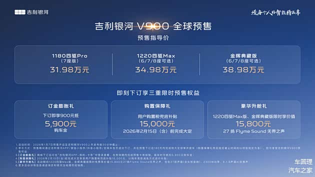 1月7日,吉利银河旗下V系列的首发之作,“AI全场景家庭旗舰MPV”——吉利银河V900正式开启预售,共计3个版本,预售指导价格区间为31.98万元~38.98万元。新车围绕中国大家庭出行的真实需求,以宽奢空间、豪华驾控、全维安全、AI智能几大全能满配实力,重新定义豪华旗舰MPV价值标准,树立AI全场景豪华出行新高度。
