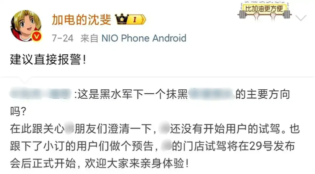 例如,在重磅新车乐道L90上市的关键节点前后,面对友商高管质疑乐道在新车宣传方面有雇佣网络水军的操作,沈斐在其个人微博直接跟帖回怼:“建议直接报警。”