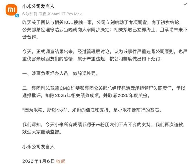 1月6日,小米官方发布消息,辞退涉事负责经办人员,并对徐洁云等高管作出通报批评。种种迹象显示出,这个事情很严重。