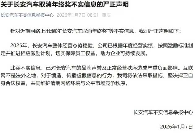 针对网传取消年终奖一事,1月7日,长安汽车进行了辟谣。在声明中,长安汽车表示,2025年,长安汽车整体经营态势稳健,公司已根据年度经营实绩,按照激励标准制定并推进相应激励计划,切实保障员工权益,助力企业可持续发展。