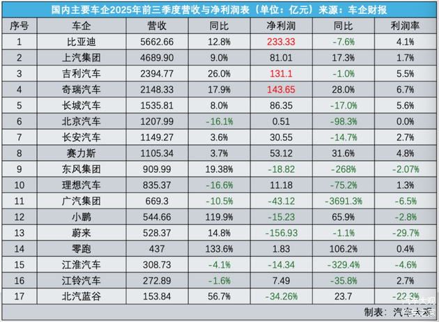 从上表可见,2025年前三季度,位列“千亿营收俱乐部”的车企不足10家。净利润在百亿元以上的只有3家:比亚迪(233.33亿元)、奇瑞(143.65亿元)、吉利(131.1亿元),利润率在5%以上的只有:奇瑞、长城、吉利。其余车企均表现为“有营收但净利润低”,或者“营收低而净利润为负”。