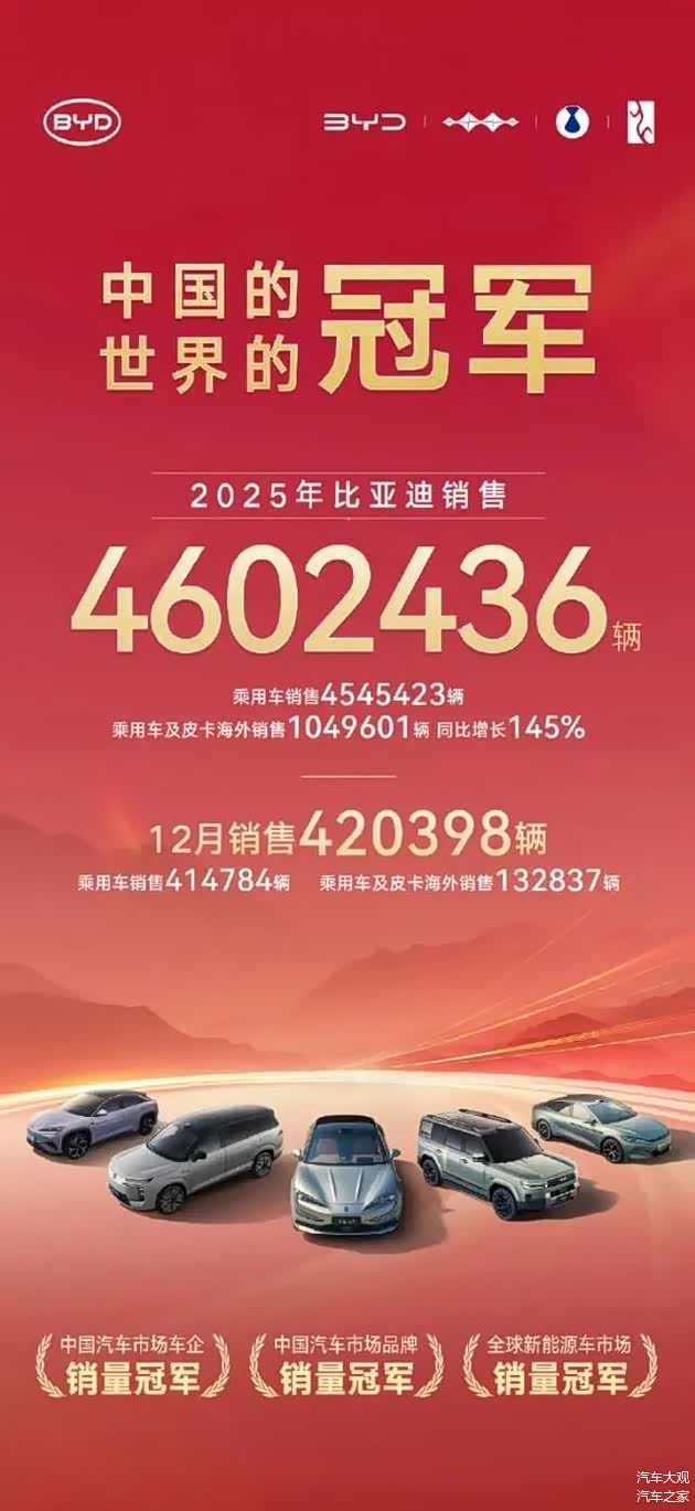 看看头部车企。比亚迪全年卖出了460.24万辆,其中,乘用车销量为454.54万辆,继续捍卫中国市场“车企与品牌”双第一。值得一提的是,比亚迪2025年海外销量达到104.96万辆,同比激增145%。