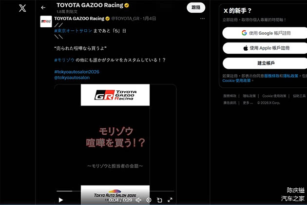 2026 年东京改装车展将于 1 月 9 日正式登场,而在开展前夕的 1 月 3 日,丰田旗下性能与赛事团队 Toyota Gazoo Racing,就刊出一段与化名为 Morizo 的丰田会长丰田章男对话,其主要透露丰田章男将于东京改装车展舞台,带来一辆神秘的中置引擎、双座车辆。