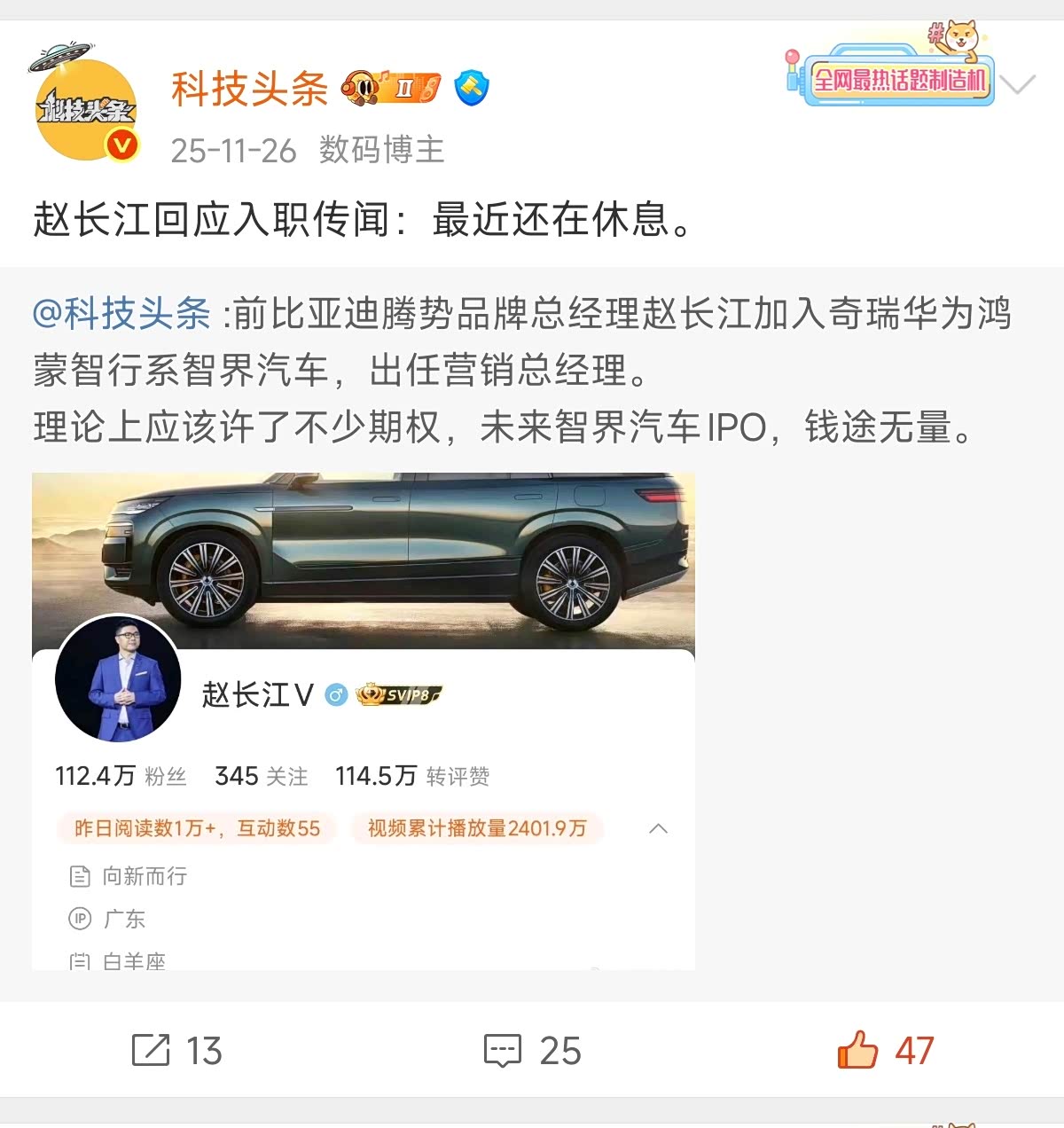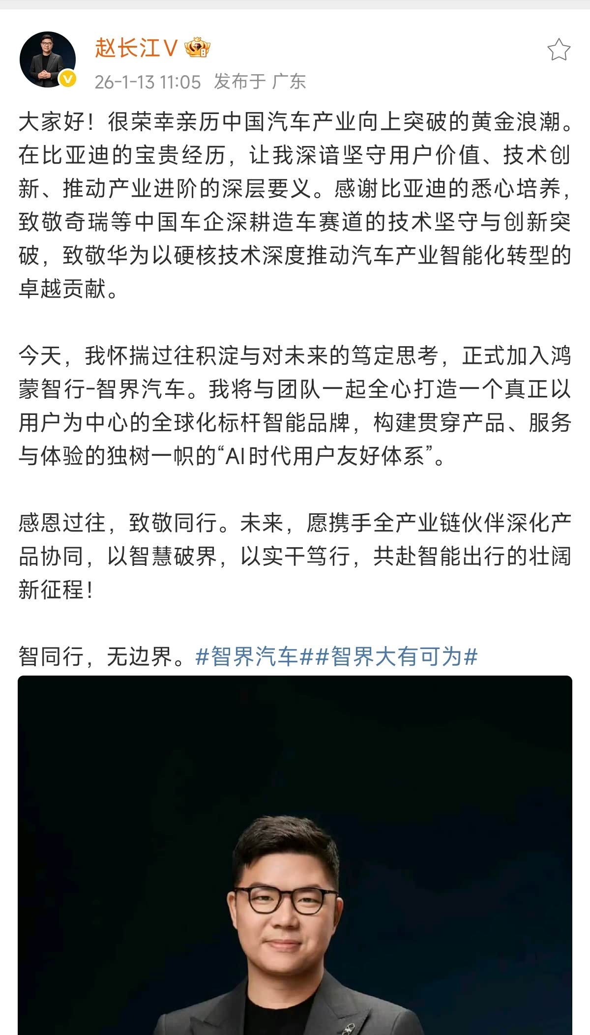 时隔一个多月,前比亚迪腾势汽车总经理赵长江官宣加入华为&奇瑞的智界汽车,出任智界汽车执行董事及执行副总裁,据说会负责品牌营销等工作。