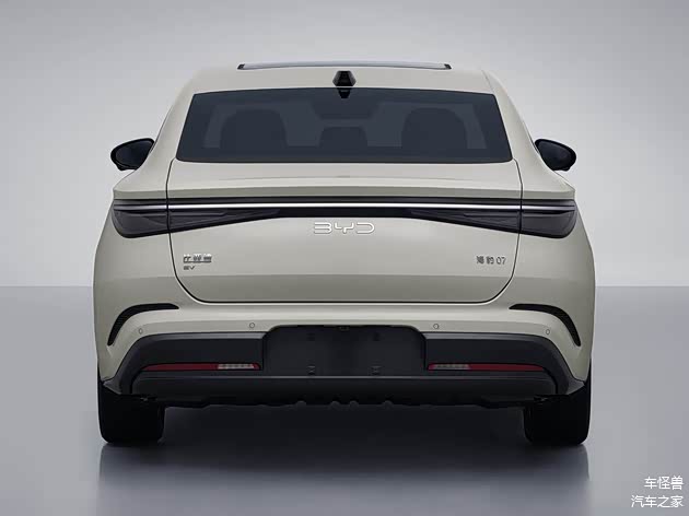 外观上,海豹 07EV 沿用海豹 07DM-i 的设计风格,机盖前端的 “BYD” 车标十分醒目。熏黑 LED 大灯支持自动头灯、自适应远近光功能,前包围两侧设有黑色导流槽,保险杠中部则是进气口。轿跑造型尽显运动气息,搭配隐藏式电动门把手与双色轮毂,鸭尾设计时尚大气。贯穿式尾灯融入细长镀铬饰条,尾门左下角 “比亚迪和 EV” 标识,明确其纯电身份。