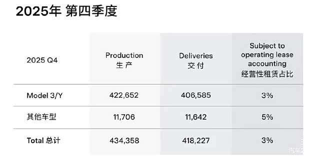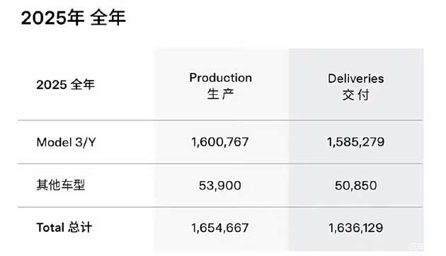 从2025年全年来看,2025年全年特斯拉全球累计生产165.47万辆电动车(包括生产160.08万辆Model Y和Model 3);全球累计交付163.61万辆(包括交付158.53万辆Model Y和Model 3)新车,但较2024年的178.9万辆下滑幅度达8.6%,低于市场预期的165万辆。从2025年全年销量情况来看,这也是继2024年同比下滑1%至178.9万辆之后,特斯拉连续第二年销量出现下滑。