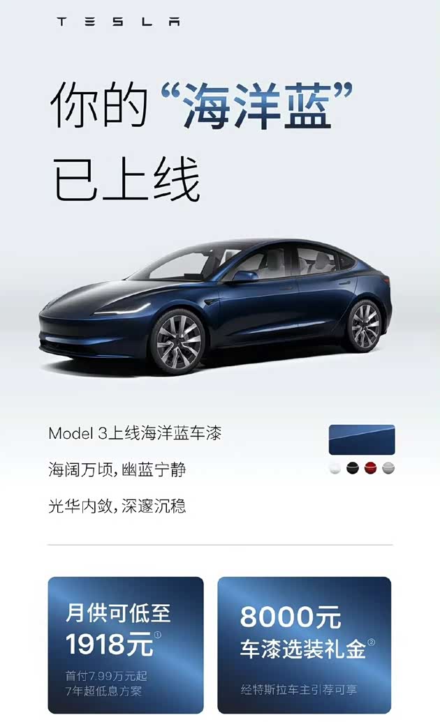 目前特斯拉全球在售车型有Model 3、Model Y、特斯拉Model Y L、Model S、Model X及电动皮卡Cybertruck。今日,特斯拉还官宣,Model 3上线海洋蓝车漆,选装价8000元,同时经特斯拉车主引荐可享8000元车漆选装礼金。据了解,目前在售的特斯拉Model 3于2025年10月上市,共推出后轮驱动版、长续航后轮驱动版、长续航全轮驱动版和高性能全轮驱动版共4个版本车型,售价为23.55-33.95万元,提供海洋蓝、星空灰、珍珠白、星钻黑、烈焰红和快银车漆颜色供消费者选择,动力上提供单电机和双电机车型。