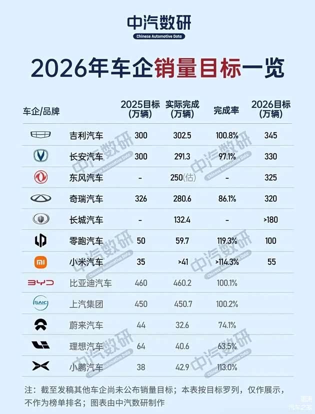 近日,不少车企已经公布了最新目标。从2025年完成情况与当前市场格局来看,2026年车企竞争将呈现“新势力加速冲量、传统车企优化升级”的分化态势。2025年,比亚迪、上汽、吉利等车企凭借成熟的产品矩阵、供应链管理与渠道布局,达成了当初设定的销量目标;零跑、小鹏以及小米汽车则依托爆款产品与高效产能爬坡,大幅超越规划目标;蔚来、理想、奇瑞等受产品周期、产能布局或市场竞争等因素影响,目标完成率相对较低。