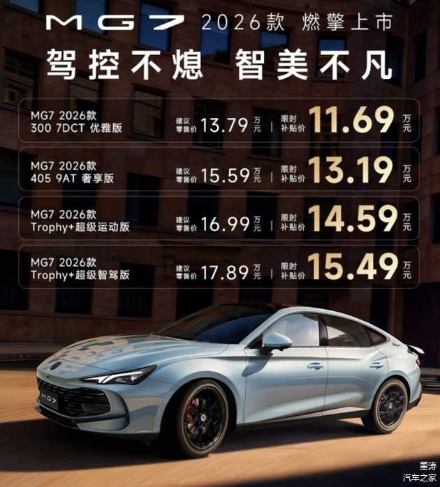2026款MG7迎来上市,4款车型的限时补贴价为11.69-15.49万元。新款车型在配置层面做到入门即高配,标配三段式尾翼、19英寸轮毂、无边框车门、可开启全景天窗、前排多层隔音玻璃等外观舒适配置;同时配备9扬声器BOSE音响、8155智能座舱、256色氛围灯、后排空调出风口、前排座椅通风等座舱配置,以及6安全气囊、360度全景影像、L2级辅助驾驶、自适应远近光LED大灯等安全与辅助配置。动力继续提供1.5T和2.0T发动机可选,匹配7速湿式双离合变速箱。