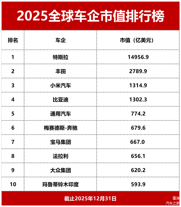 随着全球汽车产业变革持续深化,电动化与智能化浪潮推动车企市值格局再度洗牌。从2025年全球十大车企市值排行榜来看,特斯拉依旧稳坐全球上市车企市值榜首,以近1.5万亿美元的规模成为全球汽车行业唯一市值突破万亿美元的企业;市值排名第二的丰田汽车,市值突破2,789亿美元;2021年才正式进军汽车领域的小米汽车,以1,314.9亿美元排在第三;蝉联全球新能源汽车销冠的比亚迪,以1,302.3亿美元市值位居榜单第四。