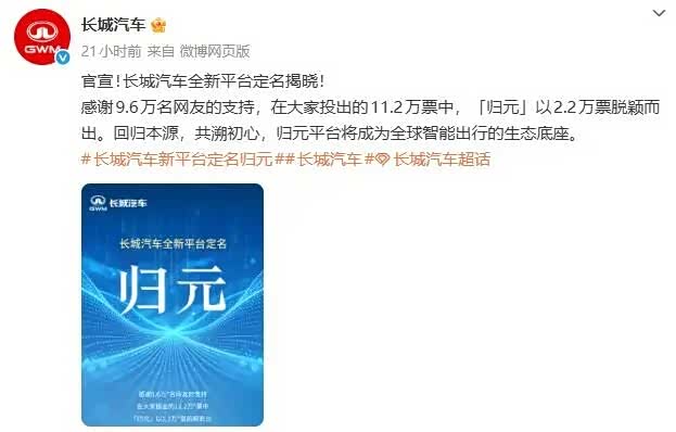 长城汽车正式官宣全新战略级平台最终命名——“归元”。这一名称历经全网征名、用户票选,由9.6万名网友共同投票选出,其中“归元”以2.2万票脱颖而出,成为这场用户共创活动的最终成果。根据官方说法,“归元”意为回归本源,共溯初心。同时,归元平台将成为全球智能出行的生态底座。据悉,该平台将采用一车多动力,从而满足不同消费群体的购车需求。